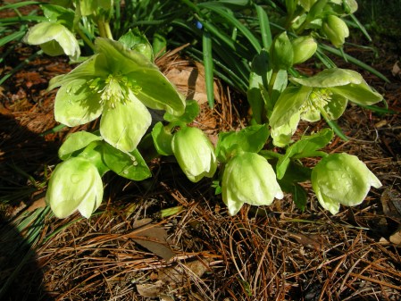 Helleborus x nigercors ‘Green Corsican’: a superior cross between Christmas rose and Corsican hellebore with many beautiful green flowers and gold-marbled leaves (just a taste, I will cover all my new hellebores in a separate article).