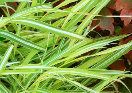 Japanese Forest Grass, Hakonechloa macra ‘Stripe It Rich’: a new cultivar of this tried and true grass for shade with gold leaves and white stripes; I treasure its lovely cascading habit (photo Terra Nova Nurseries).