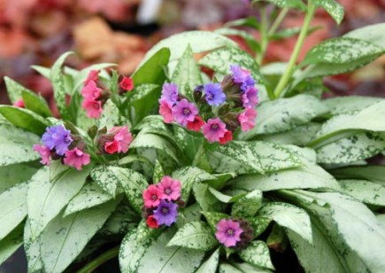 Silver Lungwort, Pulmonaria ‘Silver Bouquet’: I collect pulmonarias (especially the silver cultivars) for their early flowers and striking wintergreen leaves (photo Terra Nova Nurseries).