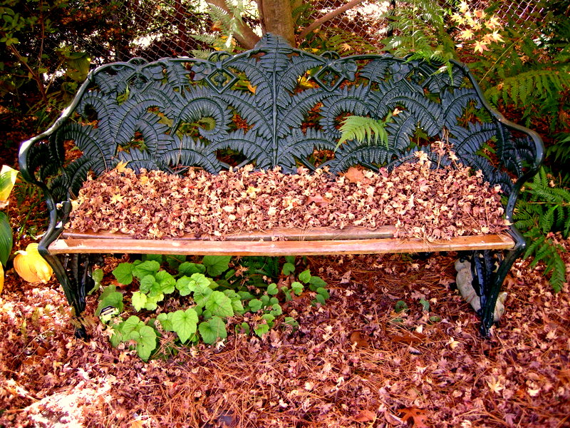 Dixie Wood Fern, Dryopteris x australis: a naturally occurring hybrid native to just south of PA, the fern growing behind and through my bench in the deep, dry shade of a Japanese maple overhung by a white pine is Dixie Wood Fern on 11/11/10—need I say more?