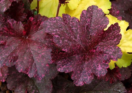 Coral Bells, Heuchera x ‘Midnight Rose’: cultivar parented by two tough species native to PA and one Pacific Northwest species; yes, it really looks like this and is a wonderful plant for containers, but requires a little more coddling in the ground because the Pacific Northwest species is more dominant in this cultivar (photo Terra Nova Nurseries).