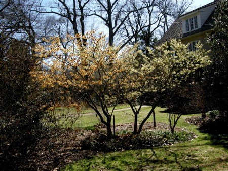 » Hamamelis x ‘Jelena’ and ‘Moonlight’ in front garden Hedgleigh Spring