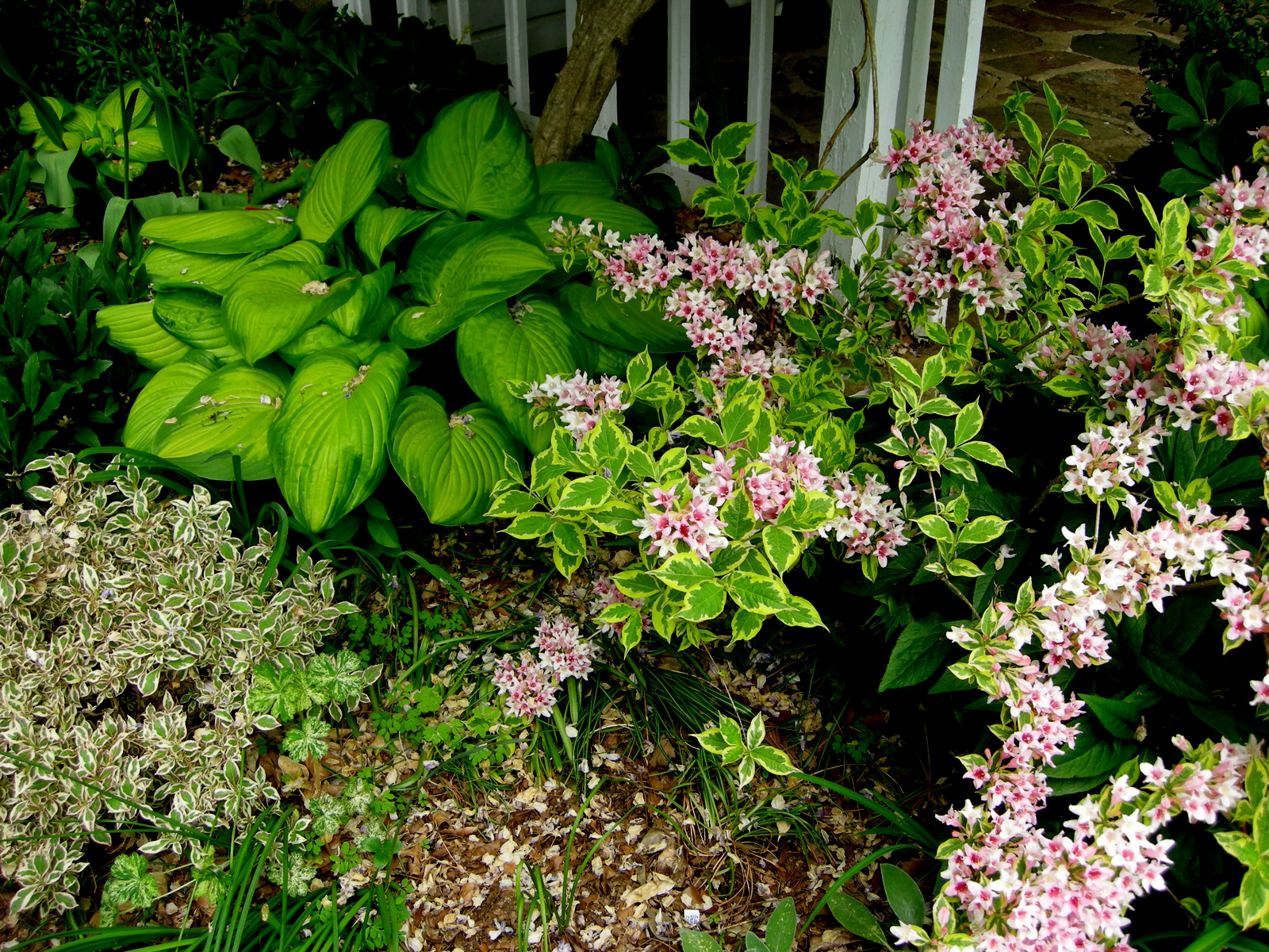 » Weigela florida ‘My Monet’, Hosta ‘Stained Glass’, Weigela florida ‘Variegata’ at Carolyn’s Shade Gardens