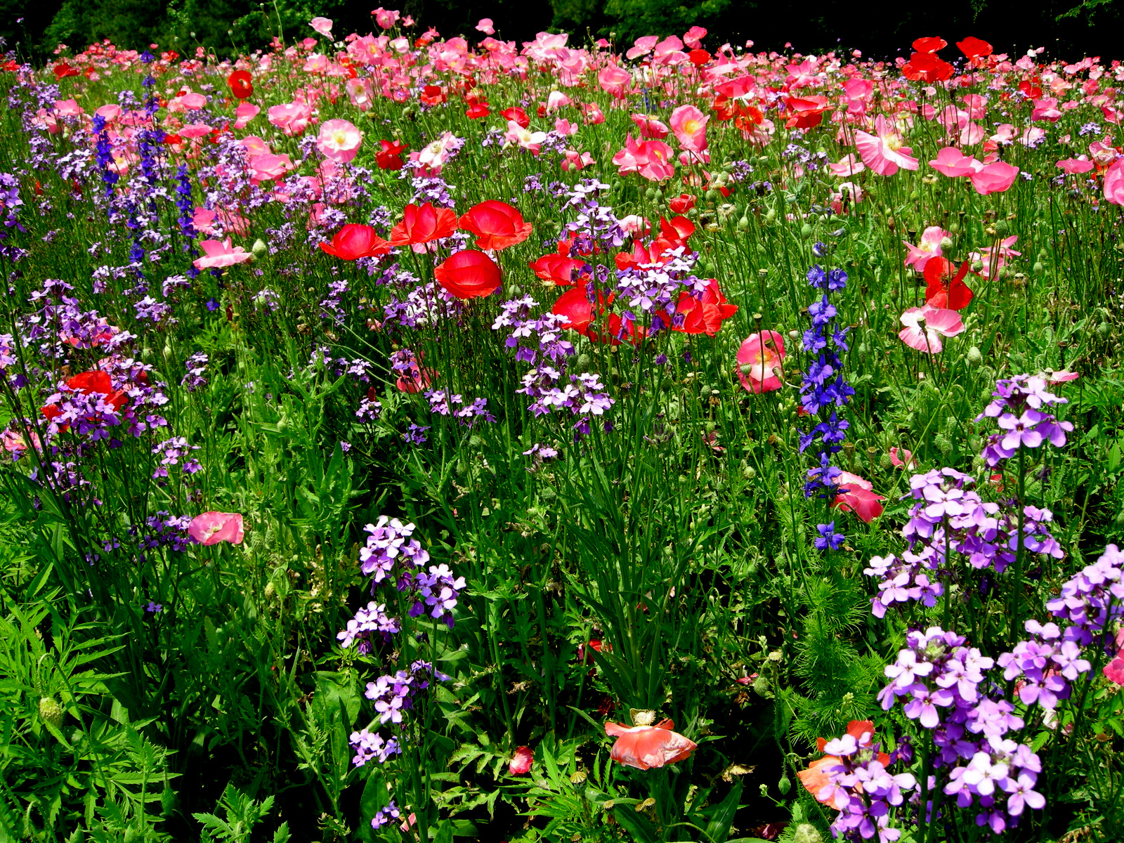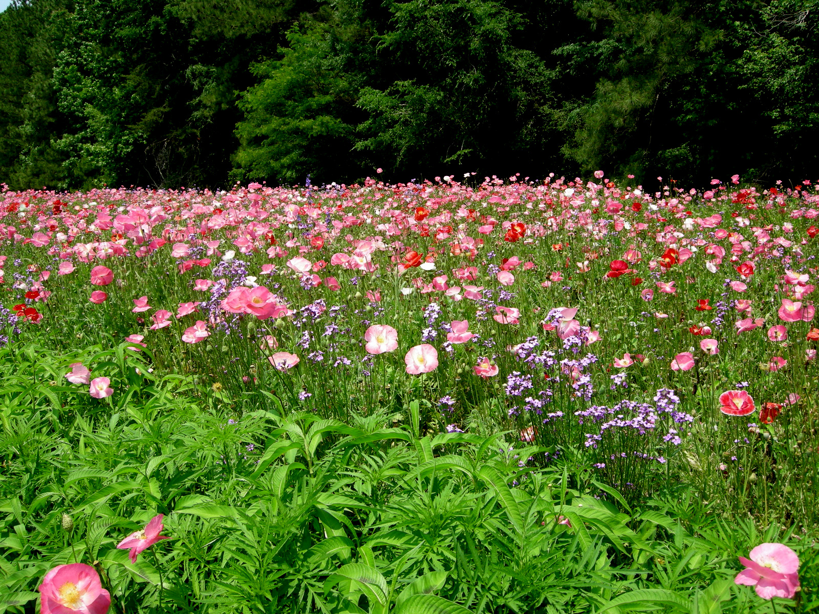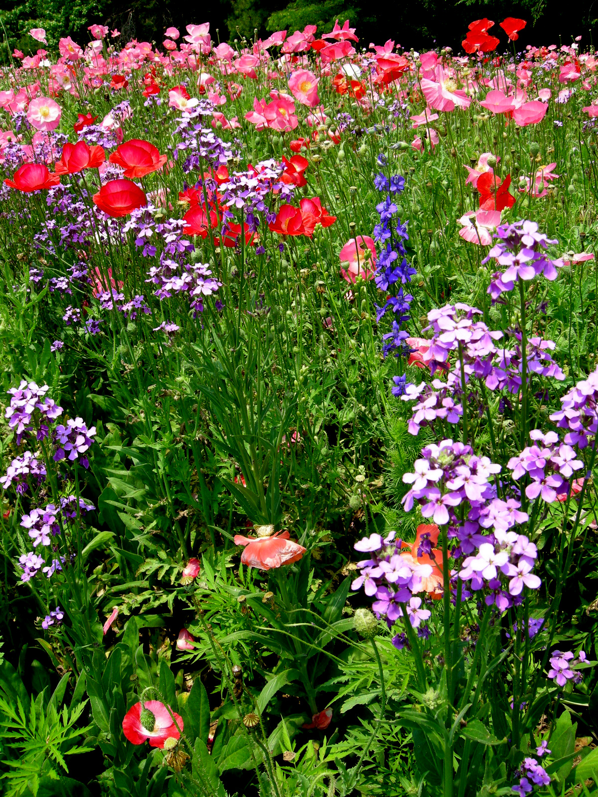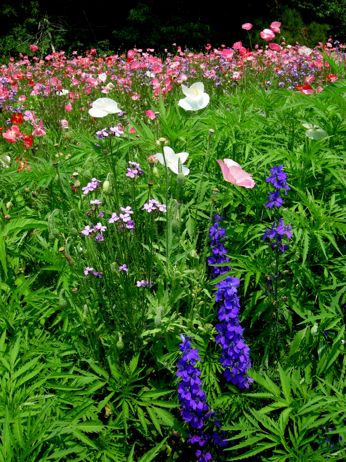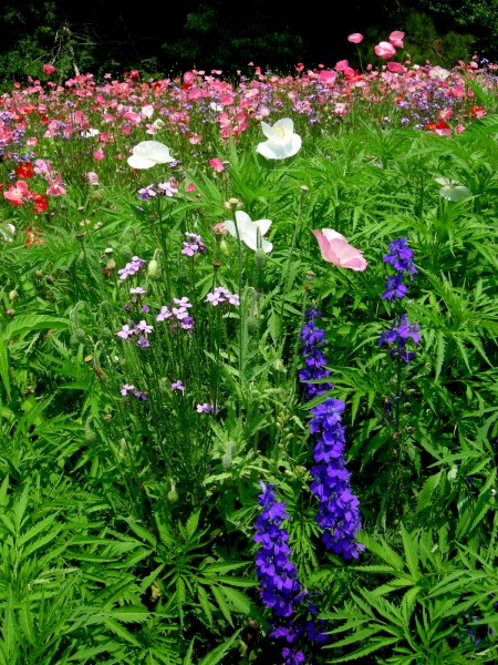 My oldest son just graduated from Elon University, in Elon, North Carolina.  My husband and I decided to make the graduation trip a mini-vacation so we spent four nights in Elon with two days dedicated to plants (of course).  Traveling to gardens around North Carolina is a pleasure due to the amazing roadside plantings installed by the highway department.  Instead of vast expanses of boring grass like we have in Pennsylvania, North Carolinians are treated to colorful displays of poppies, dame’s rocket, and larkspur.  Of course, it was an interstate so getting to the side to photograph the flowers was a hair-raising experience.  However, we made it:
