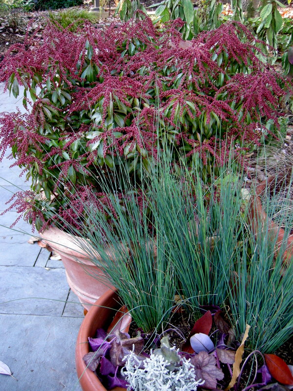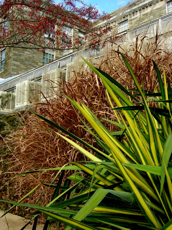 The courtyard in front of Cunningham House is packed with containers planted for winter interest.