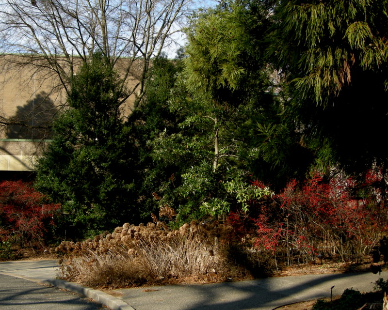 A typical scene from the campus where dried hydrangeas, winterberry, and a variety of evergreens enhance the setting.