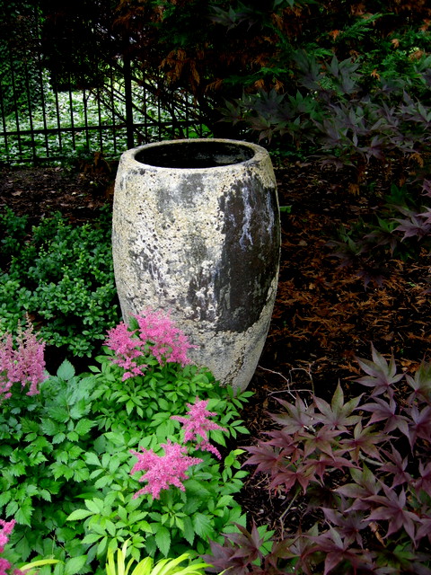 Second, if you intend to leave the containers outside for the winter, which is what I do, they must be made of a material that can withstand freezing like stone, metal, concrete, plastic, or high quality glazed ceramic. The plants in the container must also be able to withstand freezing, which hostas and all the companion plants I use are able to do. I store the large containers in place and move the small ones to a protected area and cover them with pine needles.