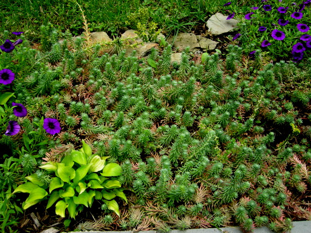 I have had this dish garden in full shade along my front steps for years. It features the bright gold of ‘Appletini’ and ‘Cracker Crumbs’ mini hostas, among others, and ‘Purple Form’ and ‘Tricolor’ sedum along with European ginger, which adds great shiny, round texture.