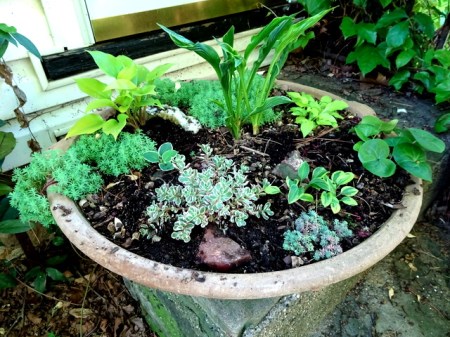 In May 2011, I wrote my fourth most popular post called Miniature (& Small) Hostas. In it I introduced a number of mini hostas and showed how to use them in the ground and in containers. To read it, click here. In this post, I continue the container theme with some new pots and some new plants in the old pots.