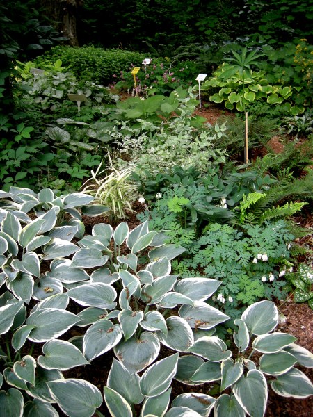 Giant Solomon’s seal on the right towers over non-native Solomon’s seal to its left. In the foreground is twinleaf, whose elegant and unsual leaves look good all season.
