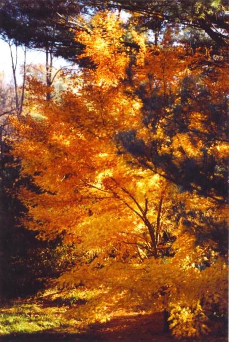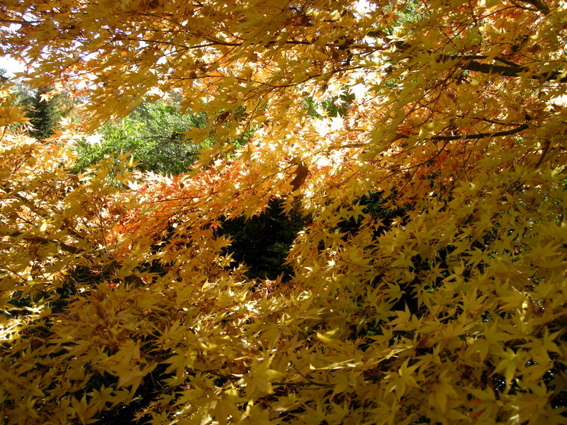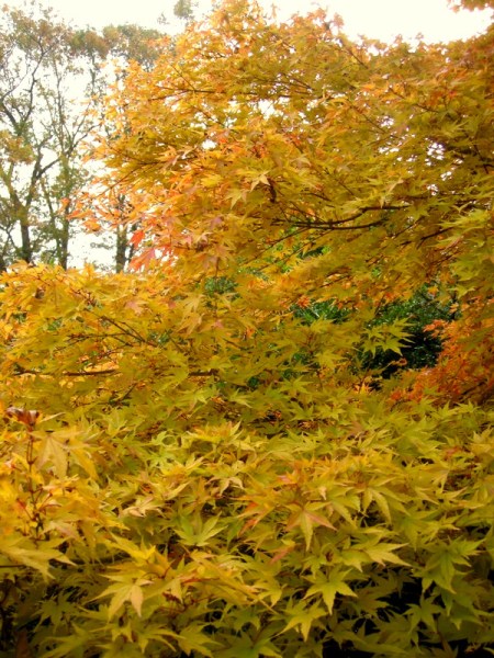 Sugar maples, behind the Kentucky coffee tree on the left and the two giant black walnuts center and right, light up the woodland in fall. For scale the ‘Butterfly’ Japanese maple is on the far right. 10/27/2010
