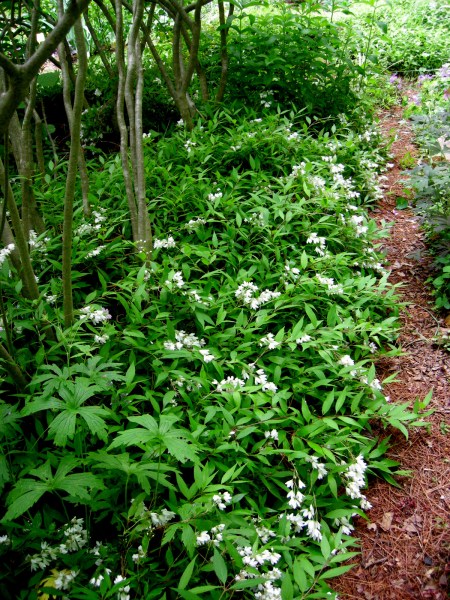 I use ‘Nikko’ dwarf slender deutzia as a groundcover in full shade under winterberry hollies.