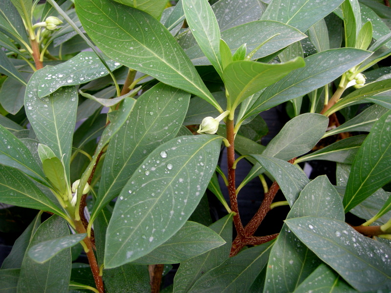 I have profiled Edgeworthia chrysantha (supposedly called paper bush but everyone calls it edgeworthia) before in my woody plants for shade series and written a post on what is one of my top five favorite shrubs.  For all the details, see Edgeworthia, A Shrub for All Seasons.  I continue to offer it again and again because it is very hard to find for sale.  I am not sure why because it is ornamental 365 days a year with an elegant habit, reddish bark, large tropically-textured leaves, gorgeous silver buds from fall to late winter, and fragrant flowers from January to March.  For all the details, including a discussion of edgeworthia’s cultural requirements, you will have to read my post.