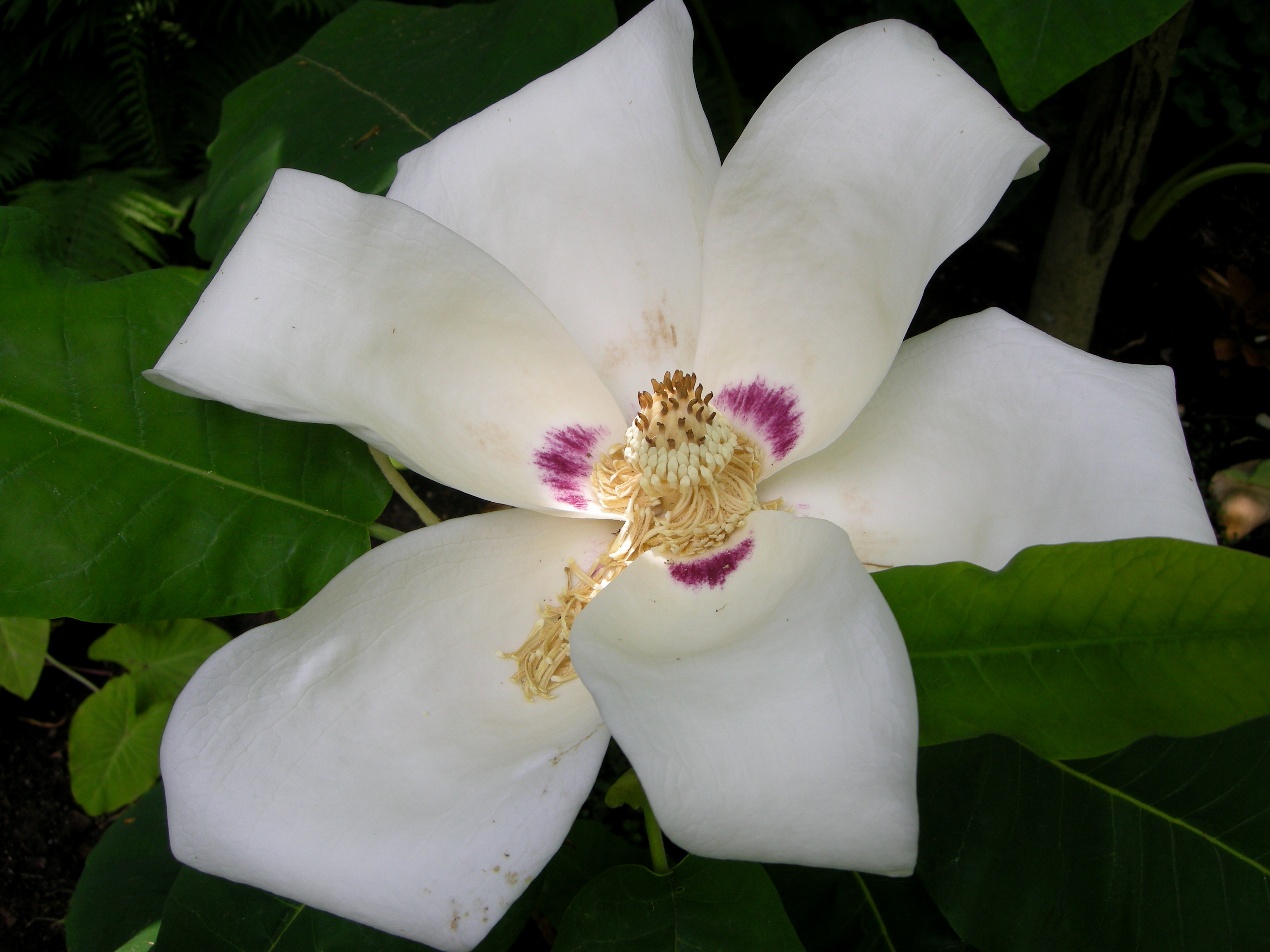 I have been coveting the native bigleaf magnolia, also known as the large-leaved cucumber tree, M. macrophylla, for a long time.  It has gorgeous, gigantic fragrant flowers and the most amazing leaves and did I say it was native?  There is even one in my neighborhood for me to lust after.  However, it’s huge, the sources say 40 feet tall by 40 feet wide, but I have seen larger specimens.  Plantsman Michael Dirr calls it a “cumbersome giant”, and it takes forever to bloom.  Imagine how excited I was when I discovered a small version of this tree tucked into a courtyard at Chanticleer.