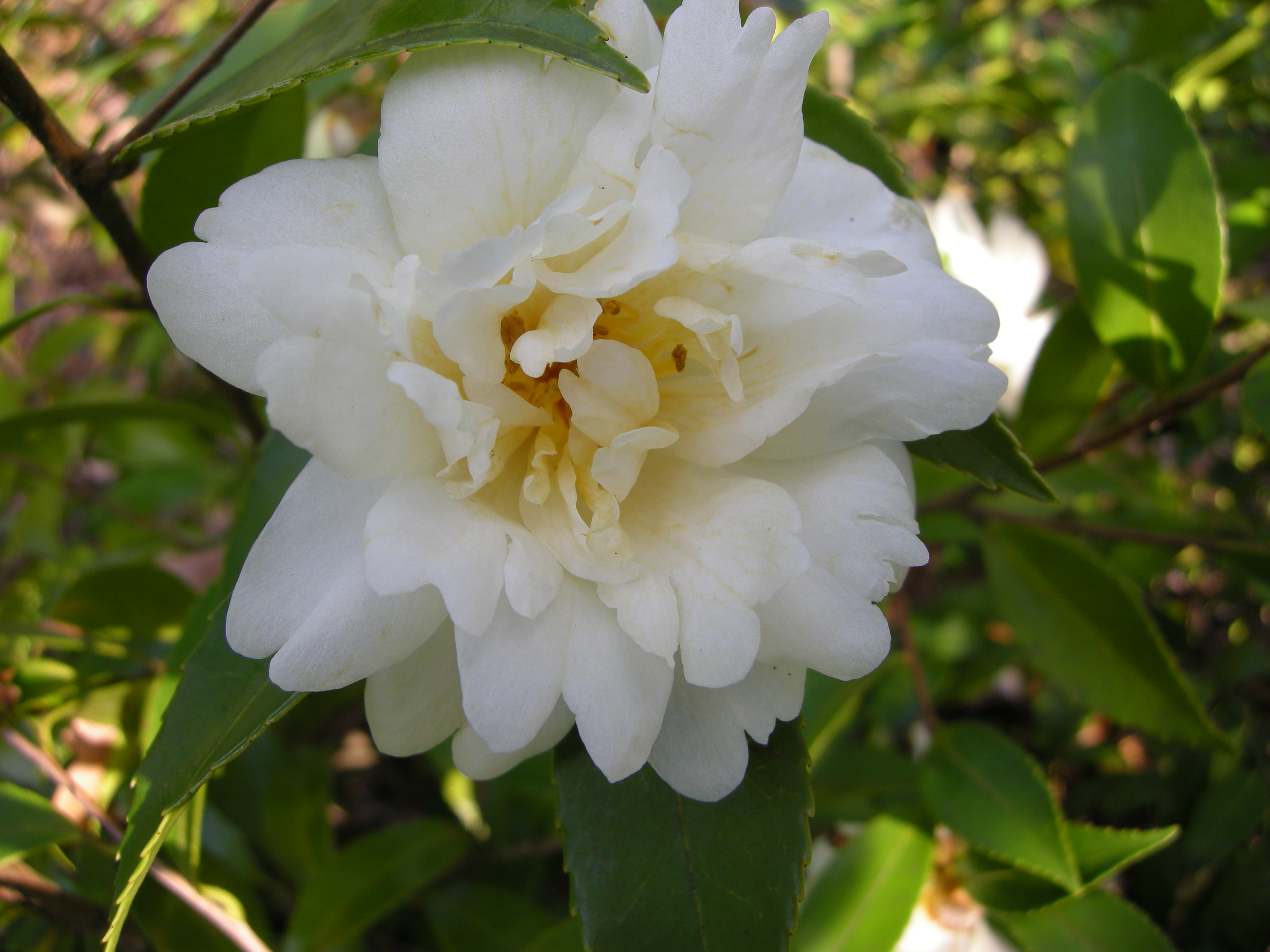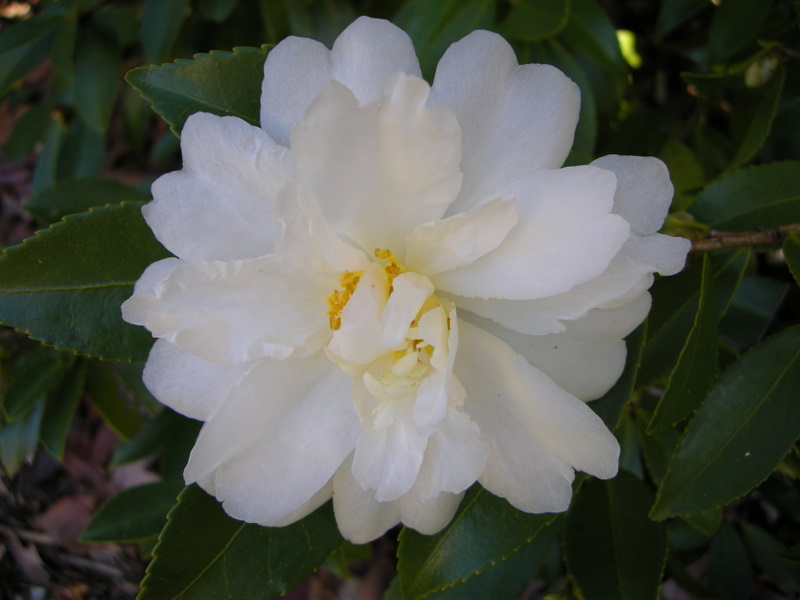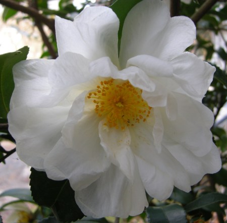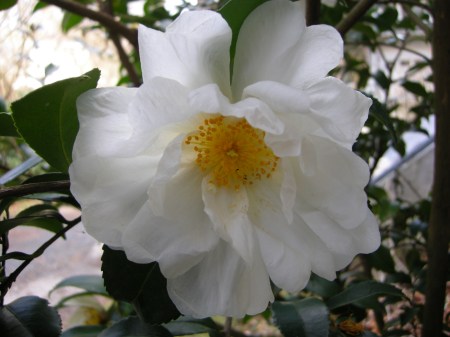 ‘Winter’s Snowman’ camellia blooms in November and December with large, semi-double white flowers.