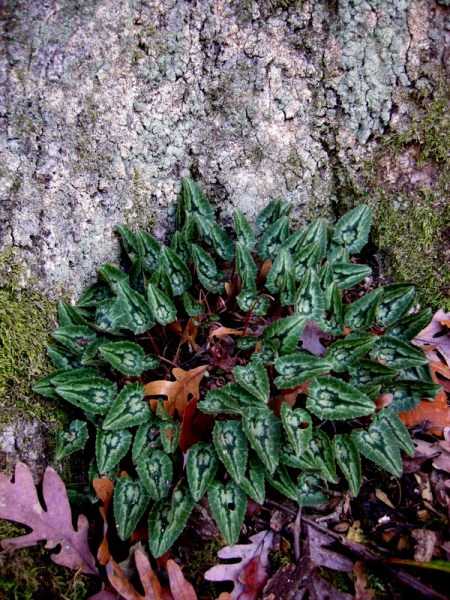 Fall-blooming hardy cyclamen is done blooming, but the leaves are gorgeous all winter. If you look closely, they all have a different pattern like a snowflake. Although I plant them where I want them, they move and thrive in sites of their own choosing. Here they were planted at the front of the bed and moved to the back directly at the base of a stone wall, one of their favorite sites.