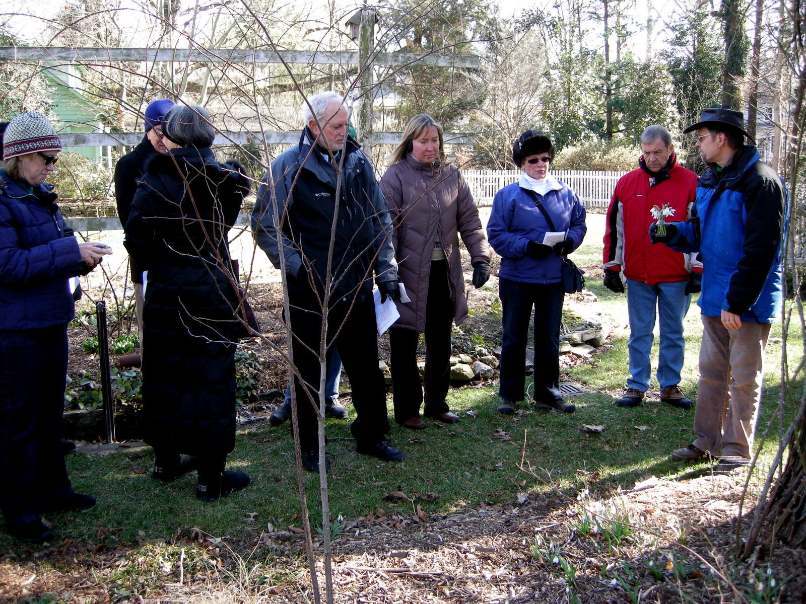 The seminars began in the front garden viewing the hybrid witch hazel cultivars Hamamelis x intermedia ‘Jelena’ (dark orange) and ‘Moonlight’ (pale yellow) underplanted with snowdrops, winter aconite, and various perennials. Charles does not recommend ‘Moonlight’ because it holds its dead leaves.