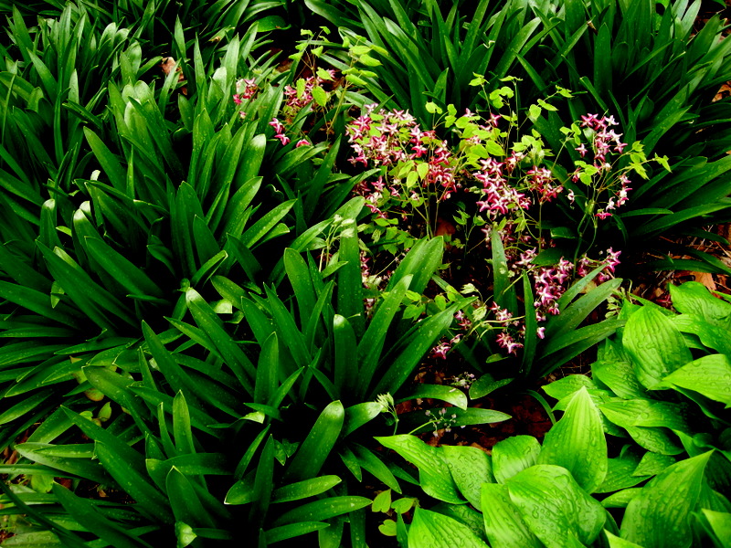 The red in the flowers of ‘Domino’ epimedium is echoed in the breathtaking, elongated, spiky leaves, making it another favorite. It also has the desirable characteristic of reblooming in late spring, and its leaves are evergreen.