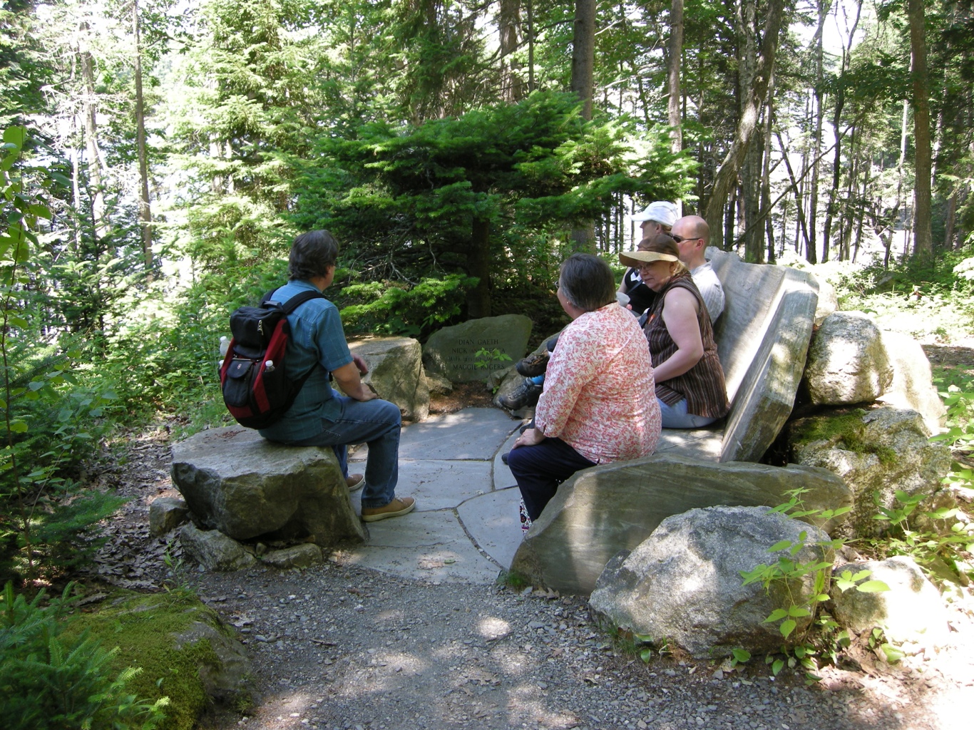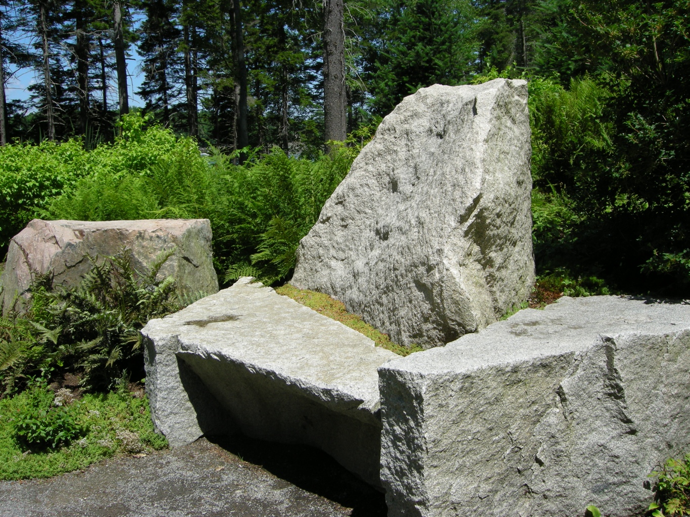 Natural rock seating in the Rose and Perennial Garden at the Coastal Maine Botanical Gardens.