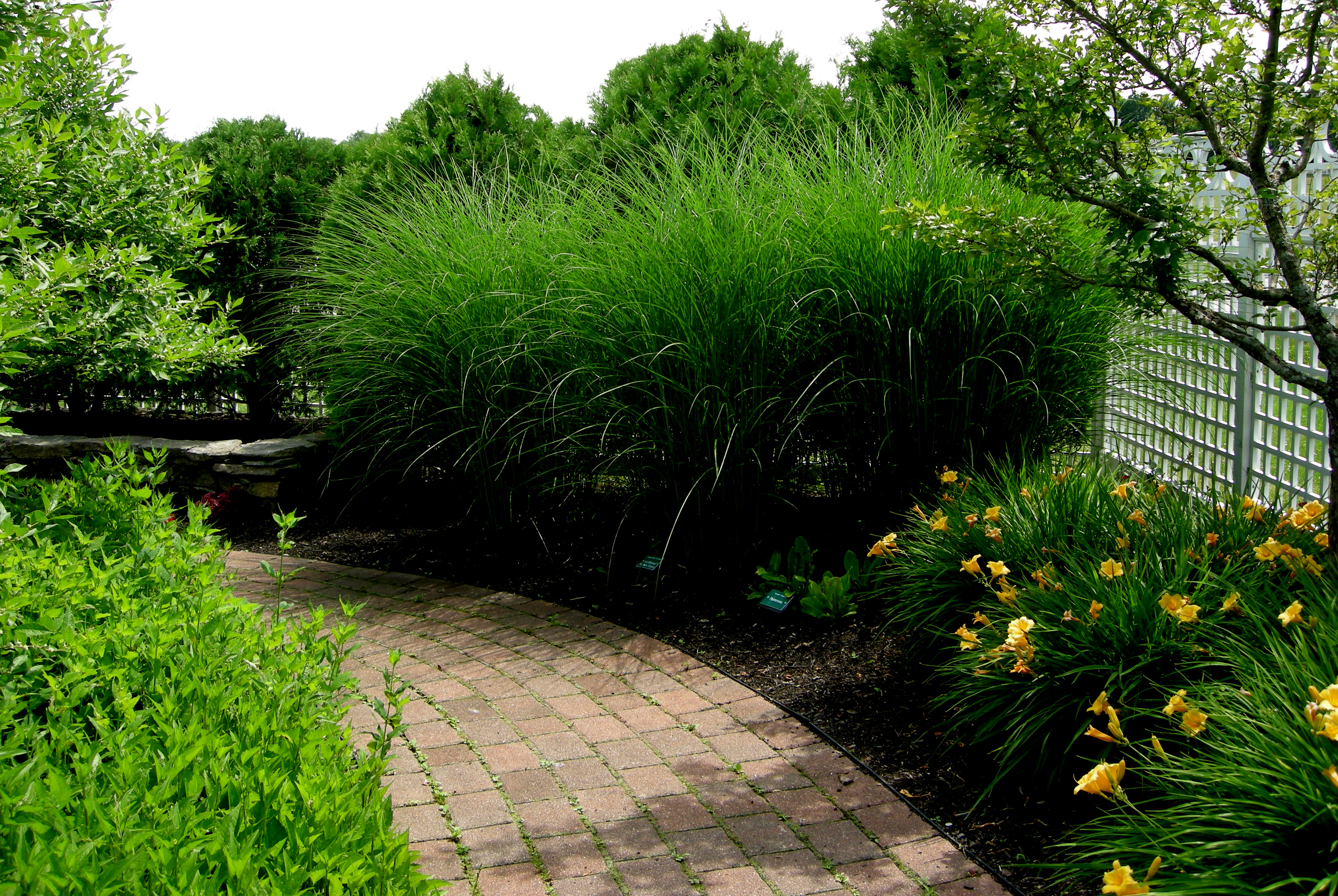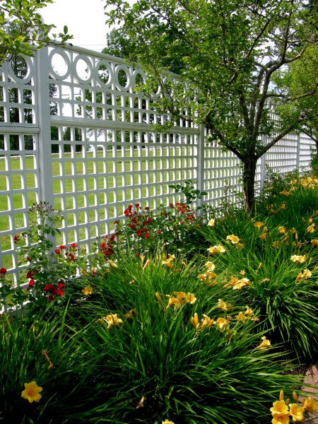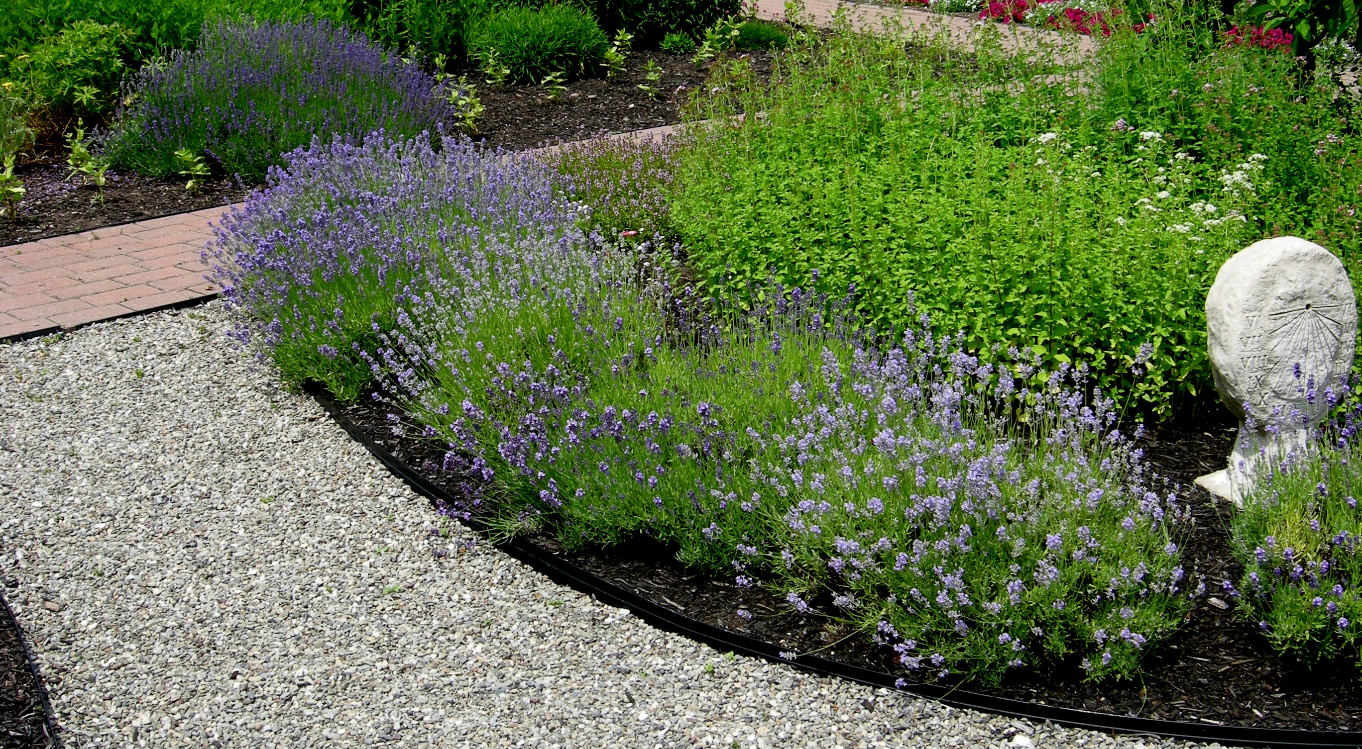 Plantings along the right side of the gravel entrance path. The unique green fencing echoes and complements the colors in the plants in front. This is not a coincidence—the whole garden integrates plants, objects, colors, and textures into a gorgeous tapestry.