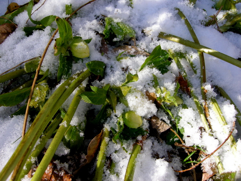 In mild winters when the leaves remain attractive, this is not a problem. It is also usually not a problem for bearsfoot hellebore whose leaves remain pristine during very cold winters. However, Corsican hellebore leaves are easily damaged, and I often make the decision to sacrifice the flowers and cut the plants back to the ground rather than look at their unsightly leaves while they bloom. I grow this species equally for its foliage, and new growth springs up very quickly when the old stems are removed.