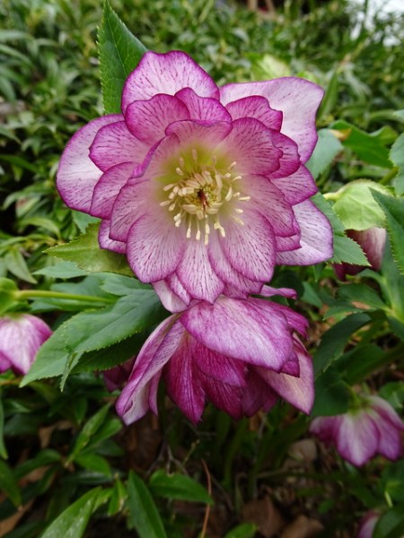 That pretty much covers care and maintenance of the hybrid hellebores and the available species hellebores. However, a large group of gorgeous species crosses are beginning to appear in local gardens (especially if the gardener has been shopping at Carolyn’s Shade Gardens), and I want to let you know how to care for them. These plants are generally the progeny of Christmas rose crossed with Corsican hellebore and/or Helleborus lividus (not hardy here) to produce elegant outward-facing flowers and silver-marbled leaves often with red highlights and stems. The most familiar crosses are H. x ericsmithii (‘Silvermoon’, ‘Winter’s Song’), H. x nigercors (‘Honeyhill Joy’, ‘Green Corsican’), and H. x ballardiae (‘Pink Frost’).