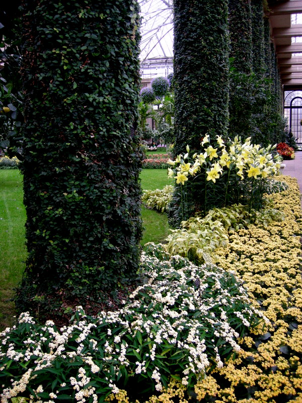 The giant columns at the end of the Exhibition Hall are ringed with orchids. A Longwood employee proudly informed me that they had just finished the display minutes before.