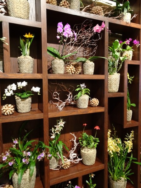 A wall of orchids outside the Music Room. The woman on the ground was giving the woman on the ladder exact instructions as to how to turn the orchid she was placing to display it to best effect.