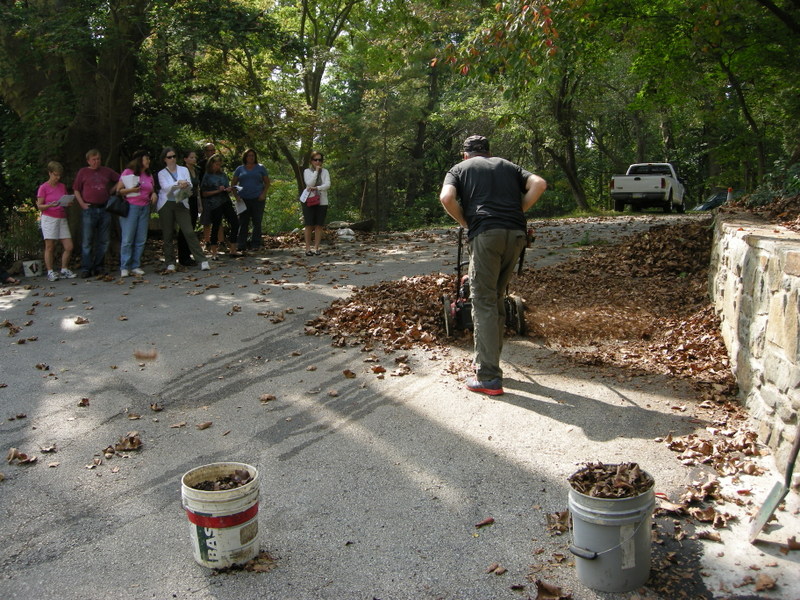 Michael demonstrates how he uses the ground leaves for mulch in our gardens.
