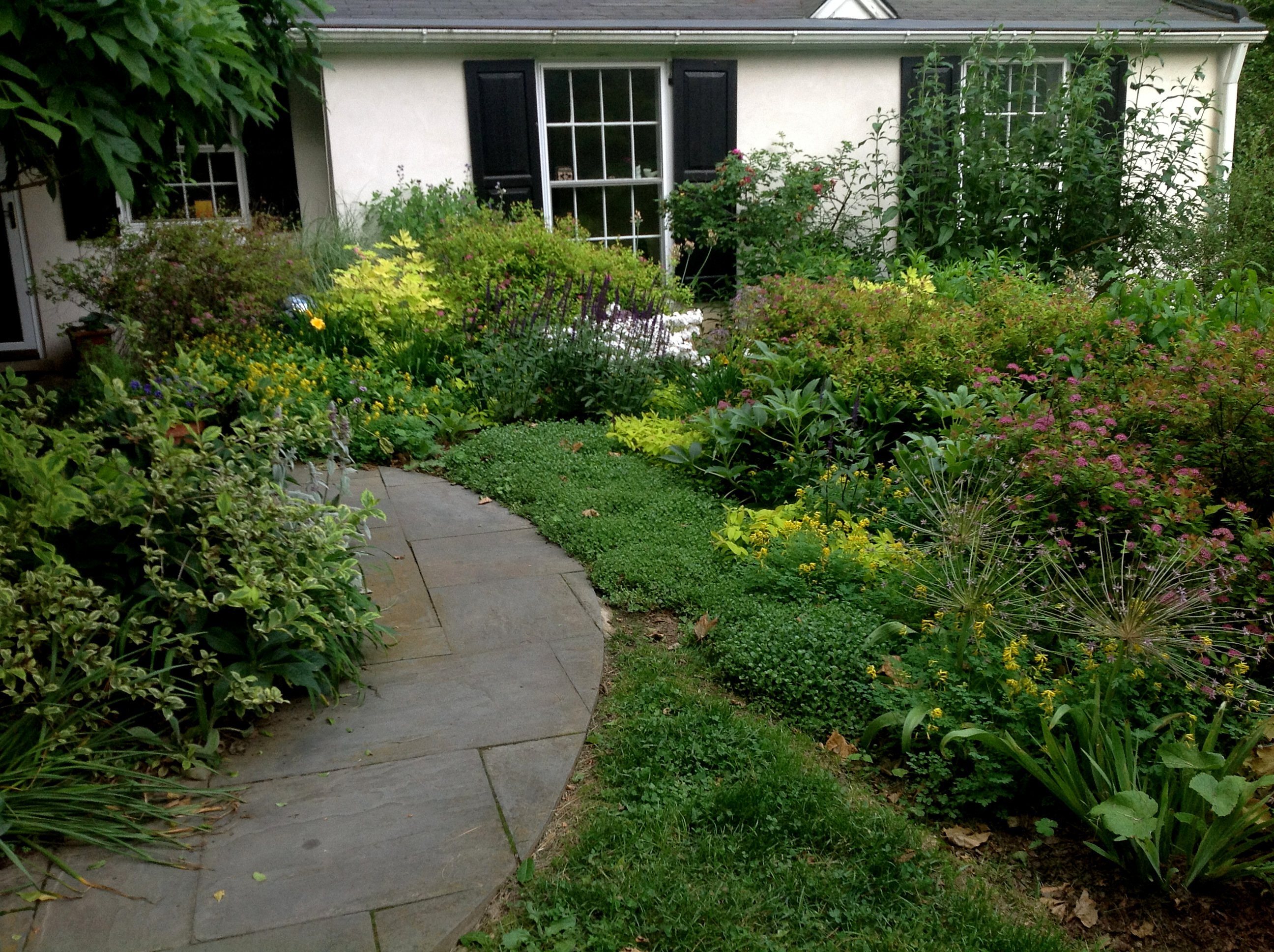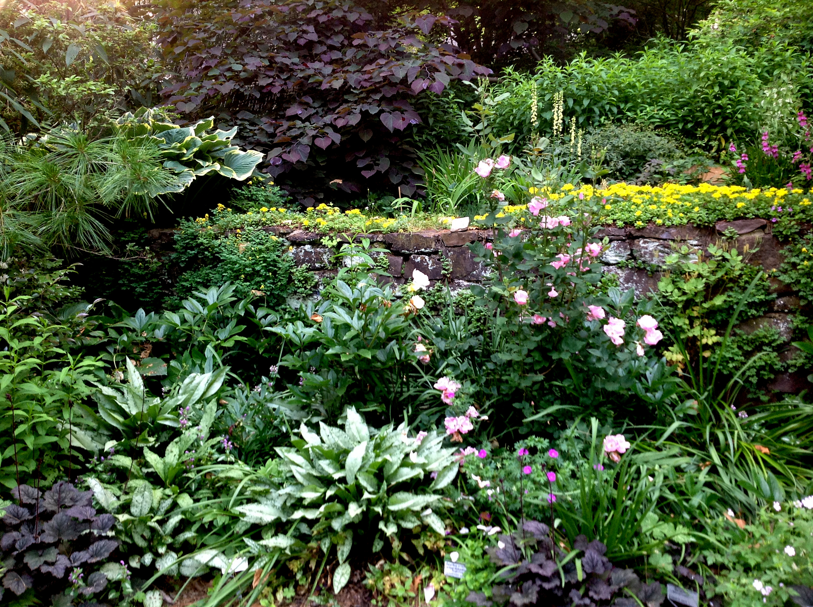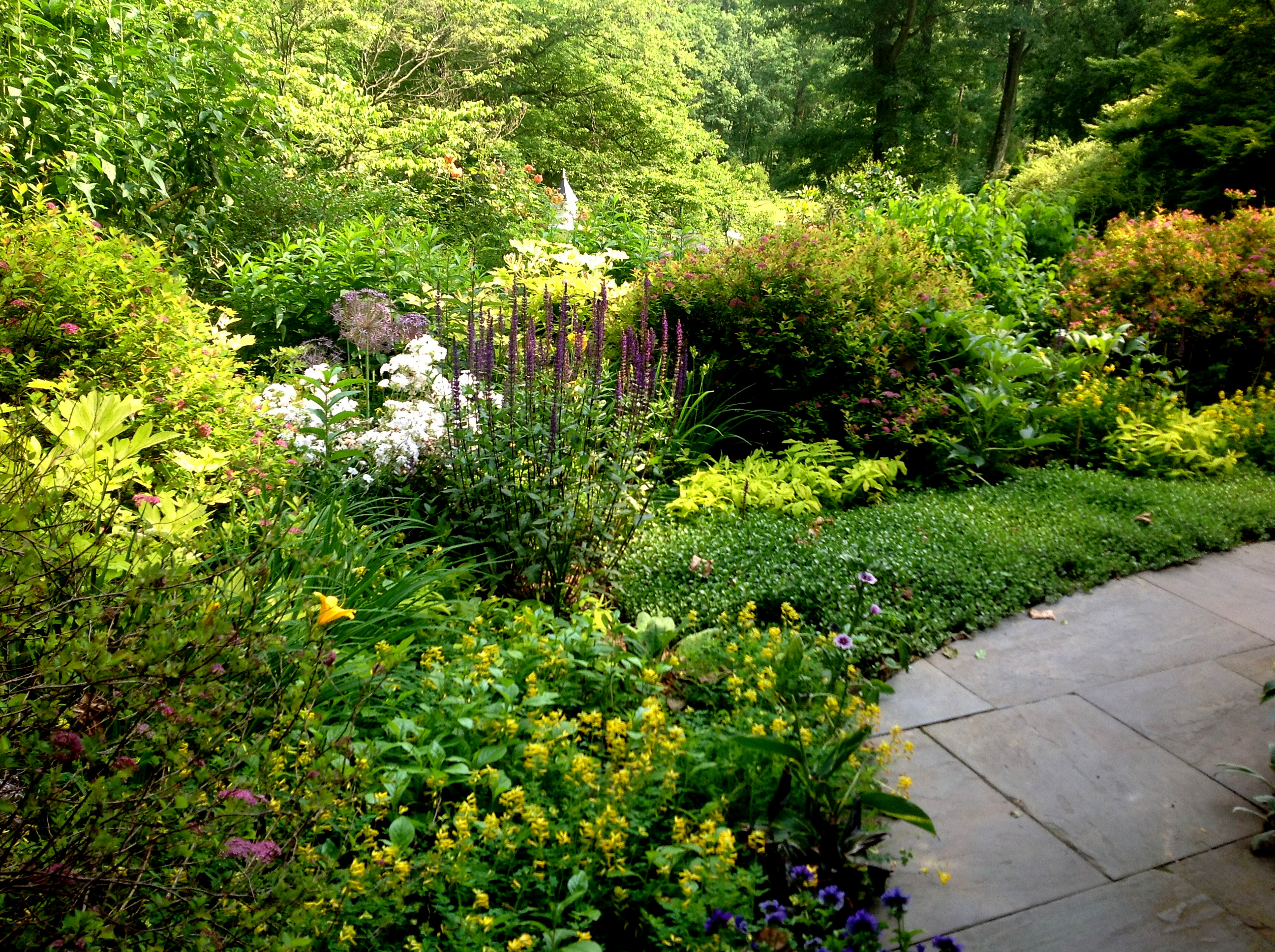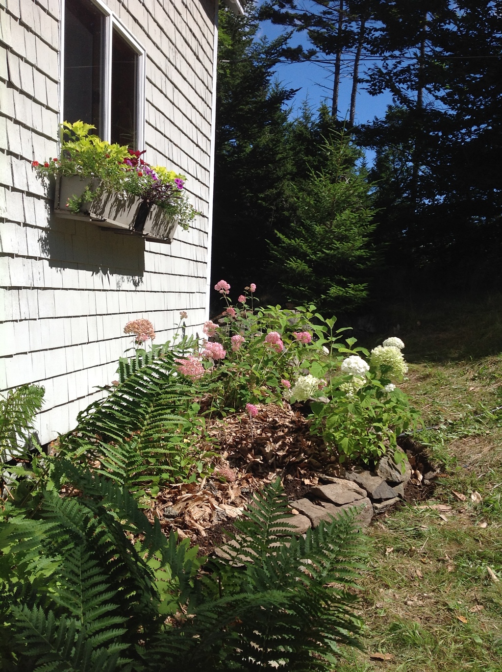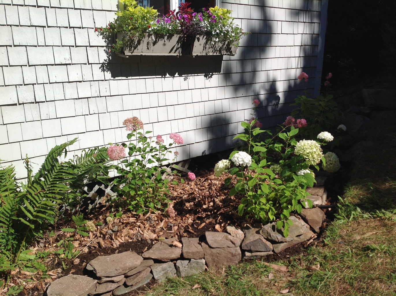 The second thing that brought me to this post was a landscaping dilemma at my family’s house in Maine. There is a perennial garden planted by the previous owners next to the front door. However, no one who uses the house wants to garden there. The native landscape is so beautiful we don’t need any added ornamentals. I had been wondering where to try Larry’s beautiful combination, and this neglected garden seemed the perfect place. I bought three pink and two white smooth hydrangea with the intention of emptying the bed and letting them fill it in.
