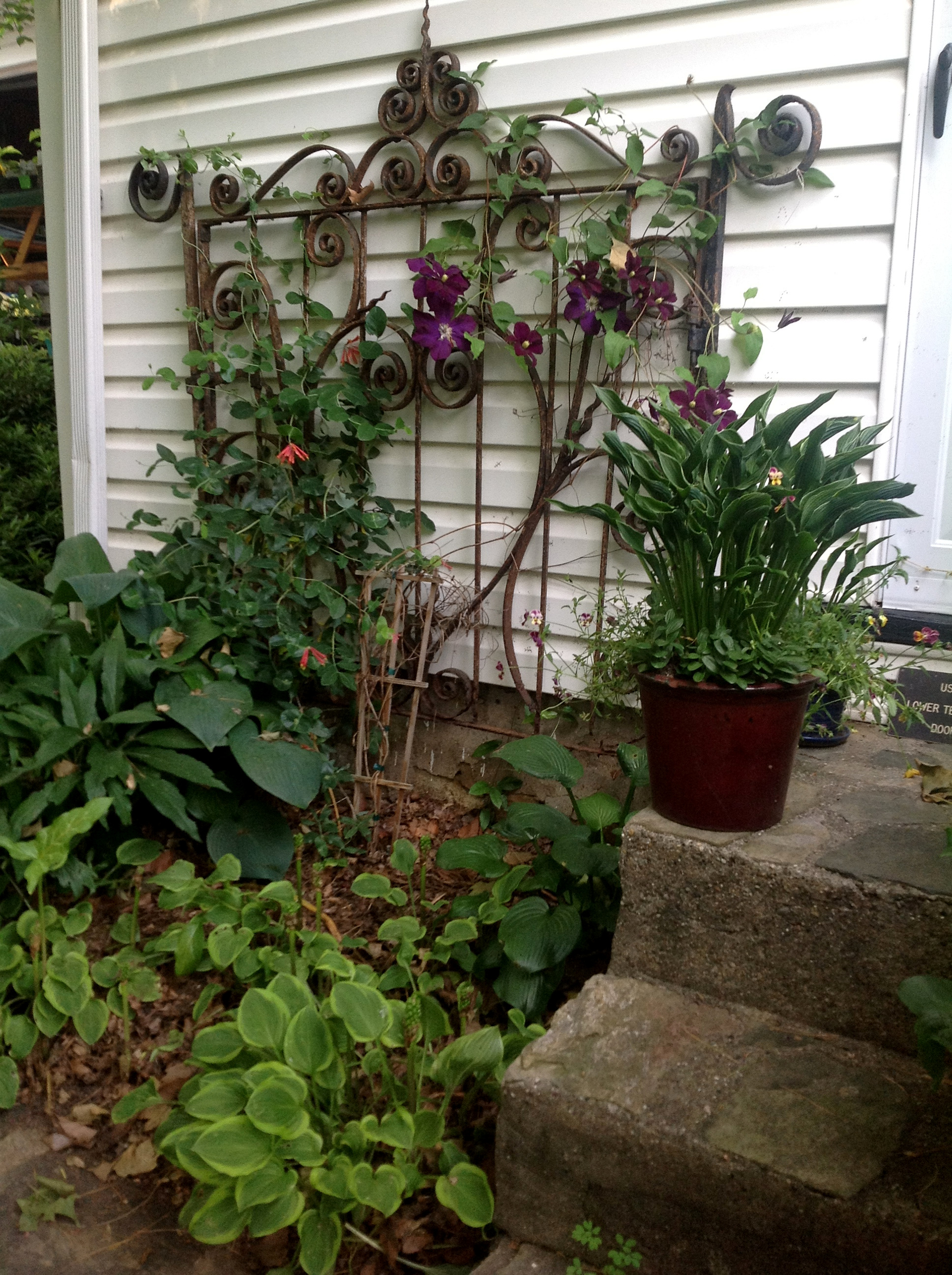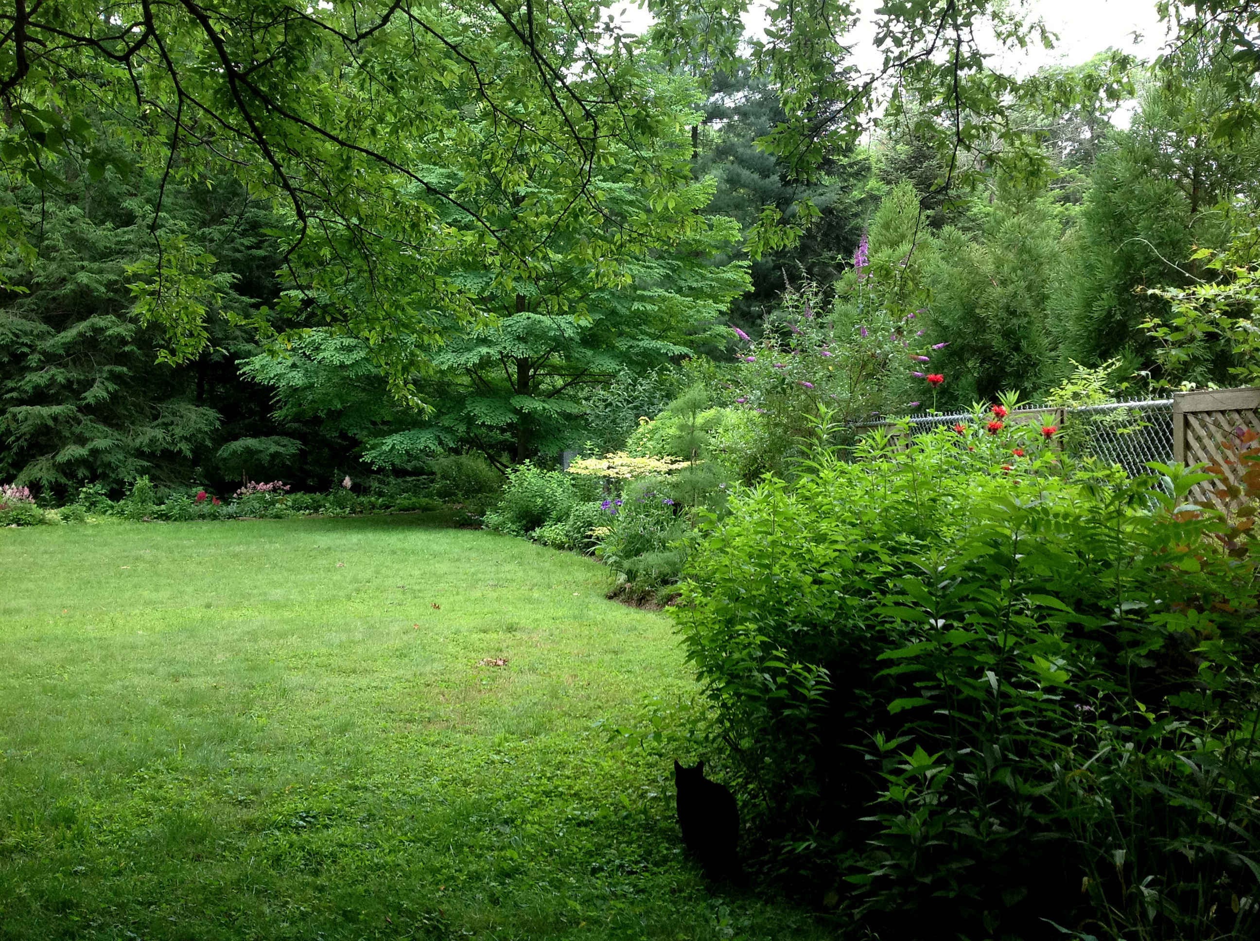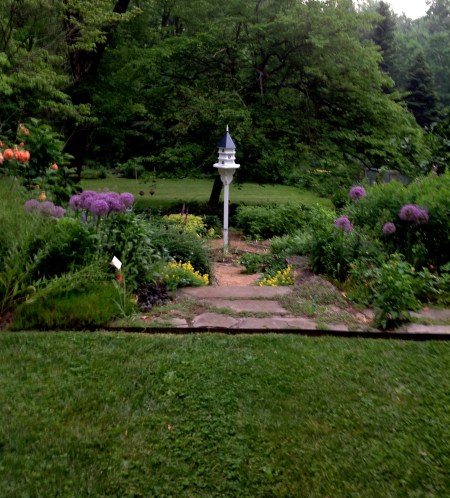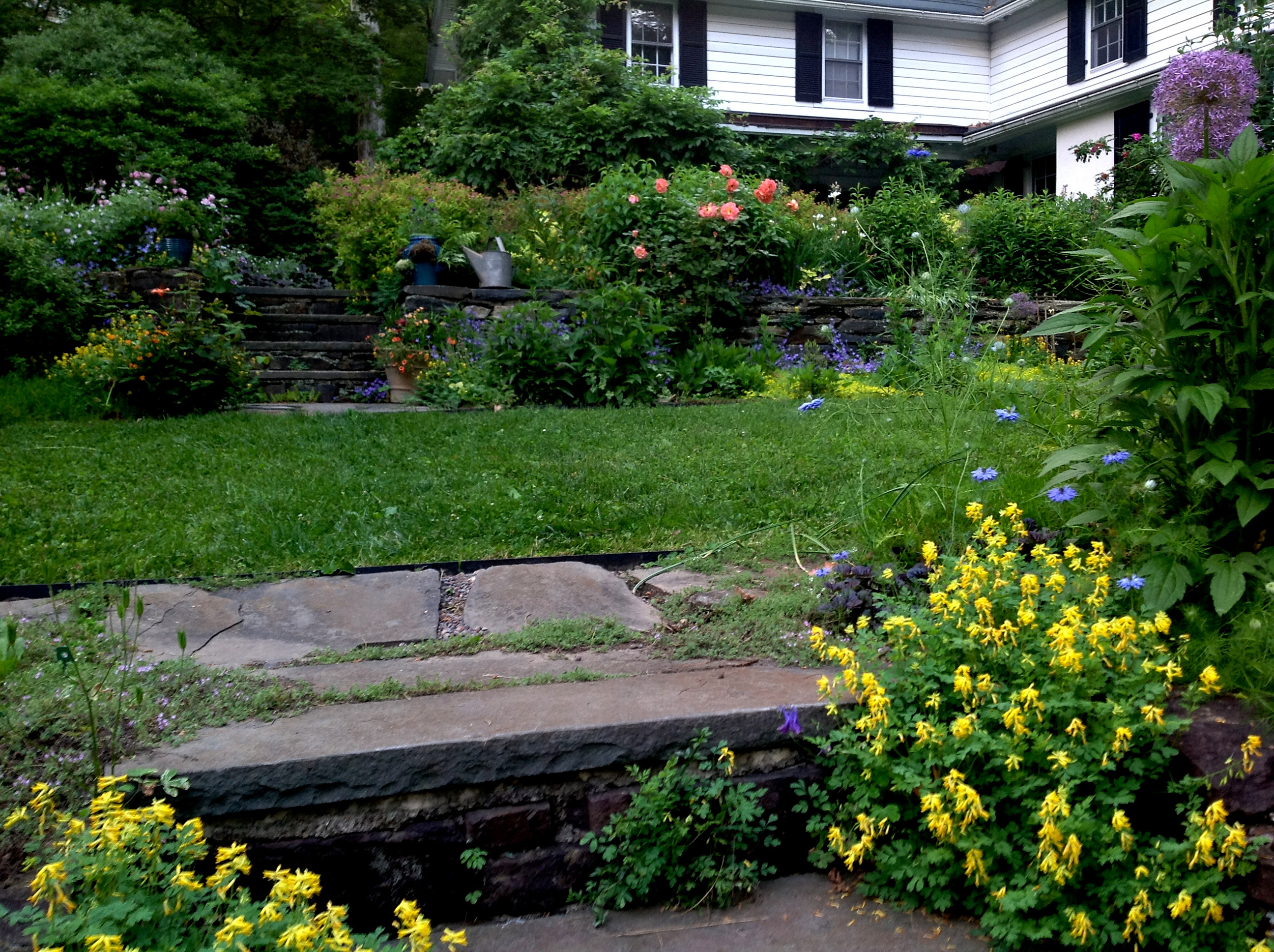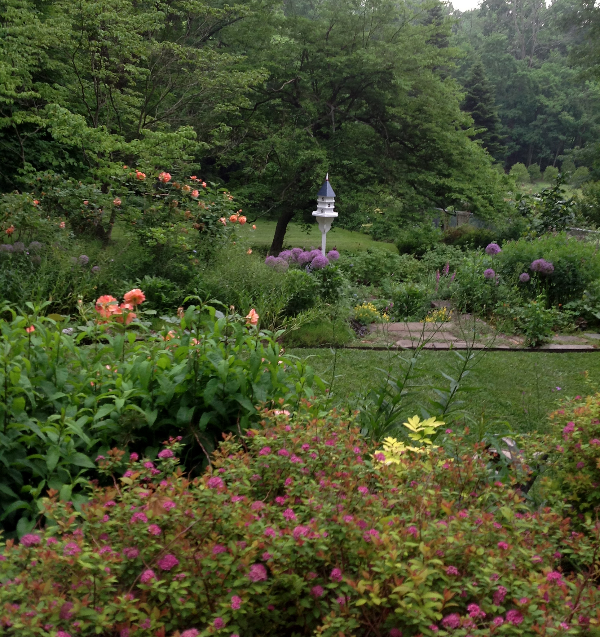 The second thing that brought me to this post was a landscaping dilemma at my family’s house in Maine. There is a perennial garden planted by the previous owners next to the front door. However, no one who uses the house wants to garden there. The native landscape is so beautiful we don’t need any added ornamentals. I had been wondering where to try Larry’s beautiful combination, and this neglected garden seemed the perfect place. I bought three pink and two white smooth hydrangea with the intention of emptying the bed and letting them fill it in.