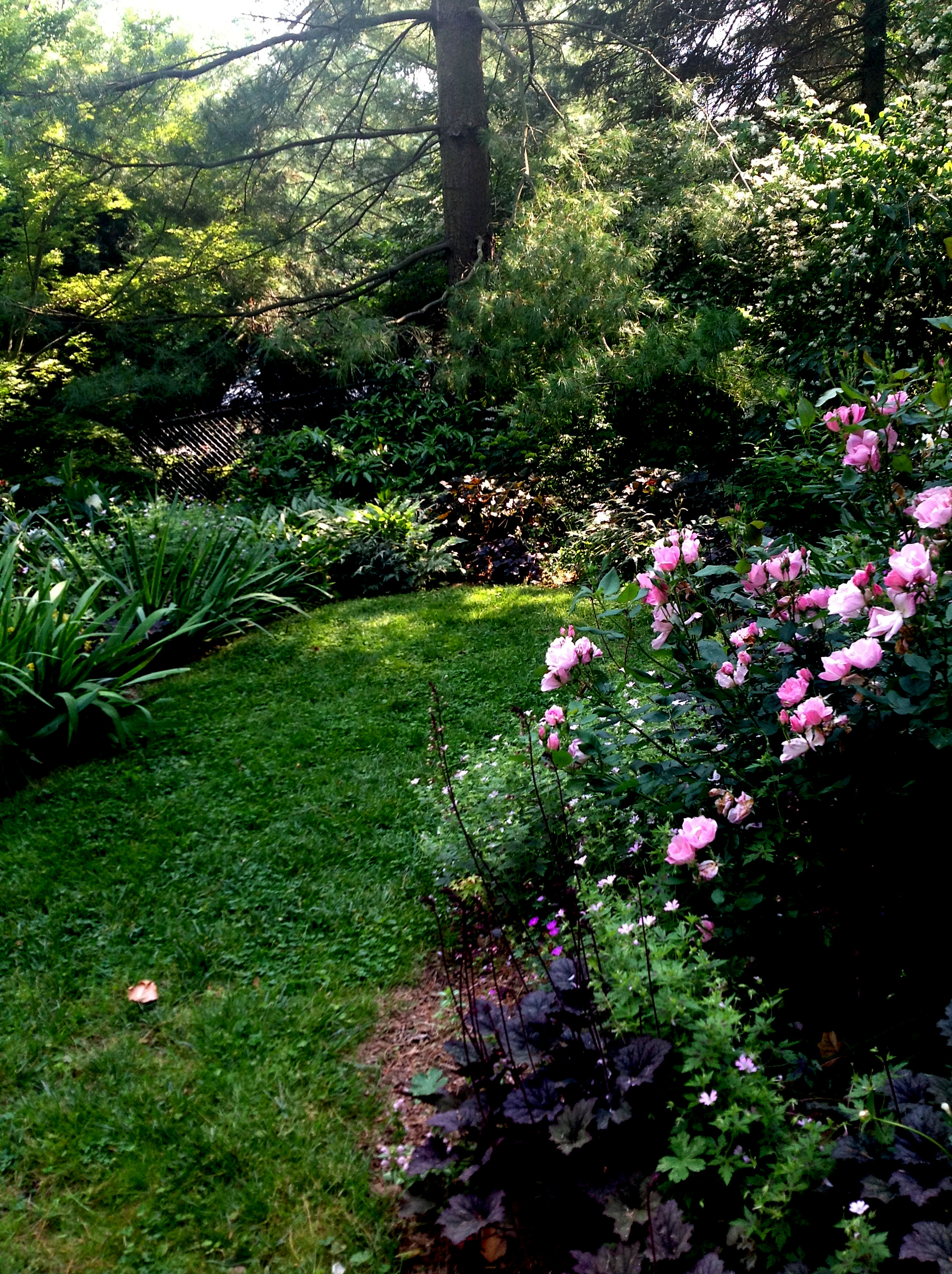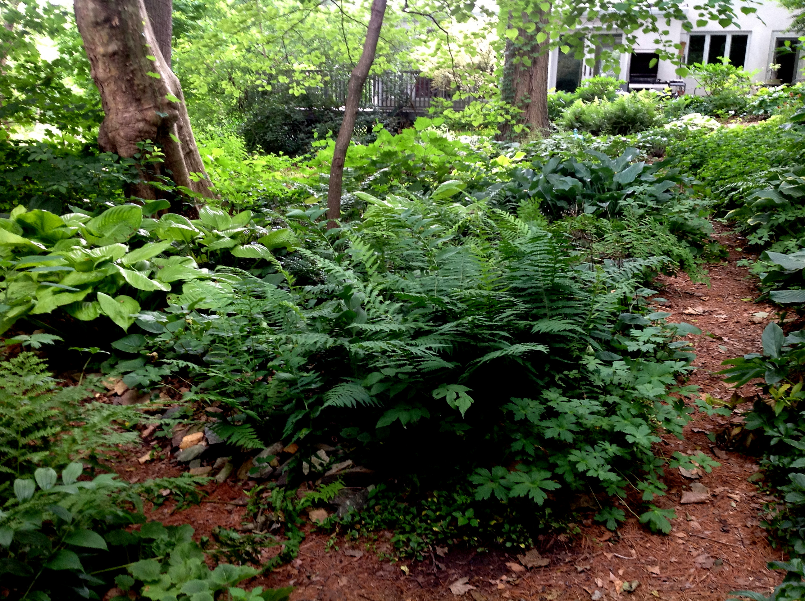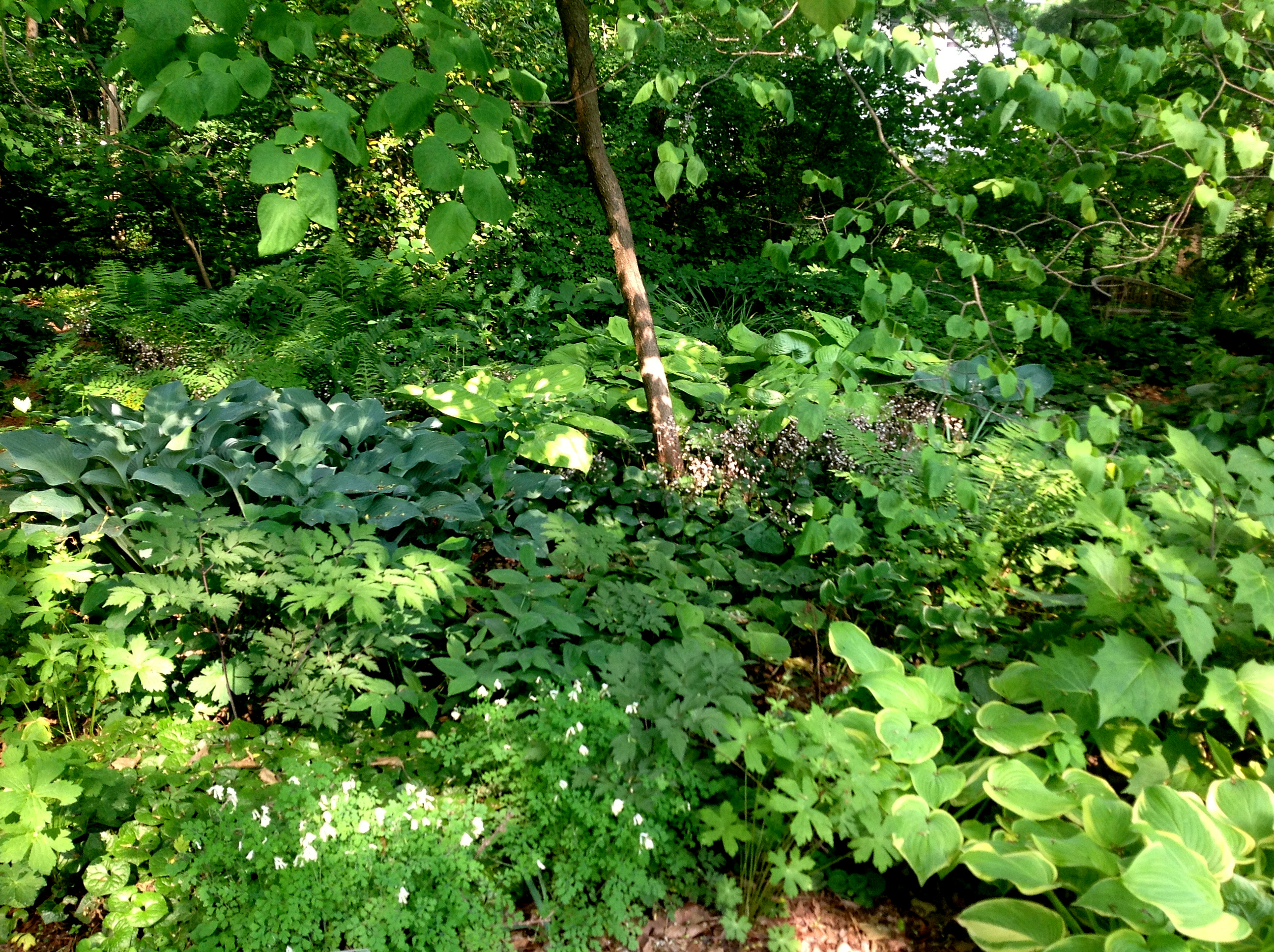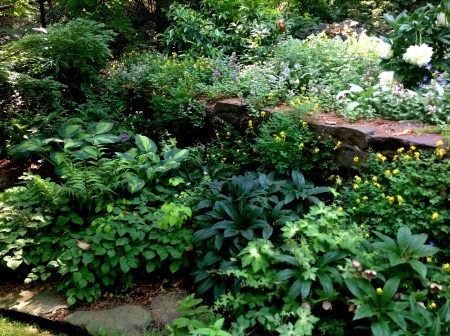 Three things came together recently to help me solve a landscaping problem that had bothered me for years. First, I was reading one of my favorite blogs called Conrad Art & Glass Gardens authored by Larry Conrad. In a recent post he talked about his favorite combinations including one achieved by massing white and pink smooth hydrangeas. I have been interested in smooth hydrangea, H. arborescens, because it is very shade tolerant. I also like it because it is a native plant found through out much of the eastern United States, including Pennsylvania. The well known cultivar ‘Annabelle’ with very large white mophead flowers was discovered in the wild in the 1960s. It grows well in Maine and has proven to be quite deer resistant on the island where my family vacations.