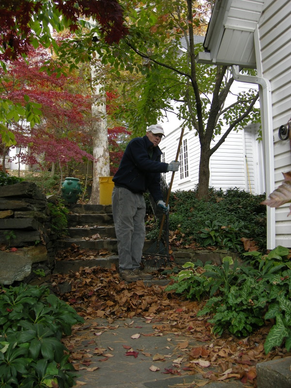 Michael demonstrates how he uses the ground leaves for mulch in our gardens.
